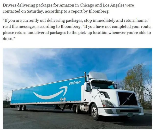 亚马逊在5月30日就给芝加哥、洛杉矶的货车司机们发布通知:“如果你目前正在外送包裹,请立即停车回家。如果您还没有完成您的路线,请在您有能力的时候将未送达的包裹退回到取货地点。”