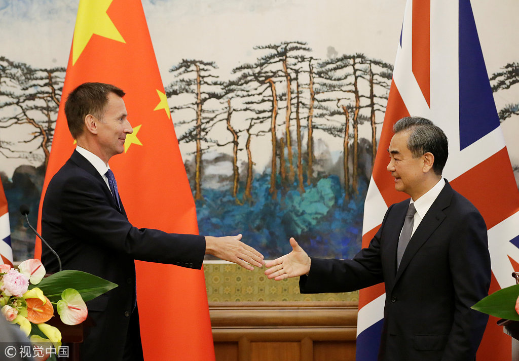 7月30日,北京,国务委员兼外交部长王毅与英国外交大臣杰里米·亨特出席新闻发布会。杰里米·亨特于7月30日对中国进行正式访问。